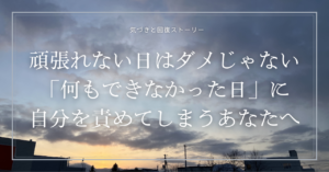 何もできなかった日、あなたは自分を責めていませんか? 「今日は、どうしても頑張れない」そんな日って、ありませんか? やらなきゃいけないことはあるのに、体も心も動かなくて、 「こんな自分じゃダメだな」「もっと頑張らなきゃ」 […]